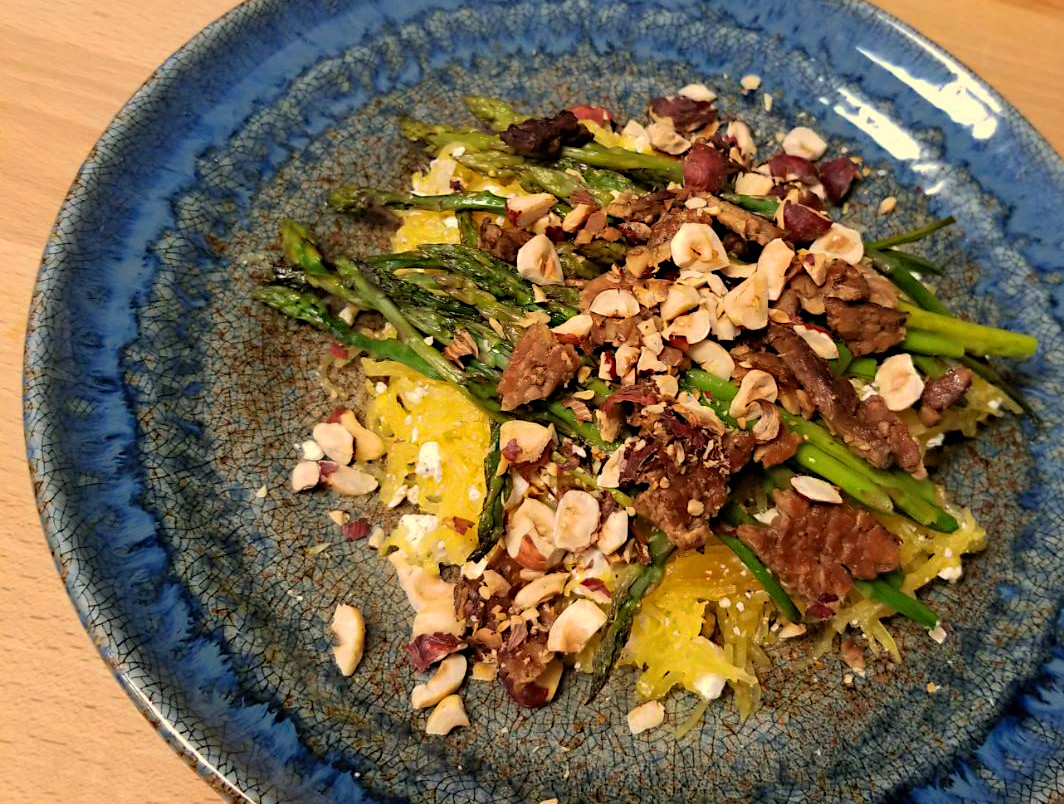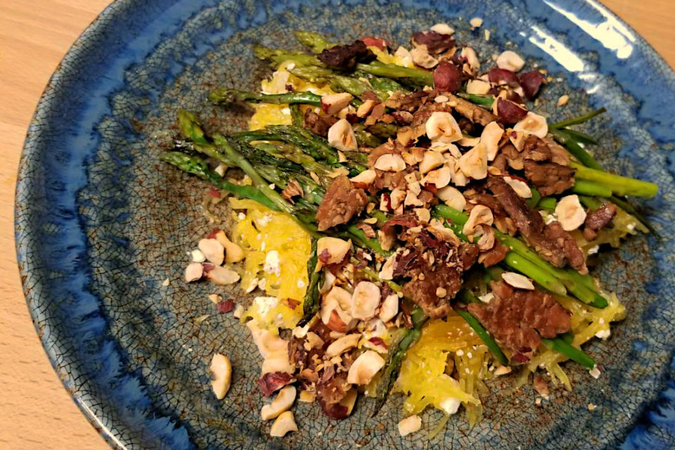 Spaghetti squash, asparagus, hazelnuts, ricotta salata