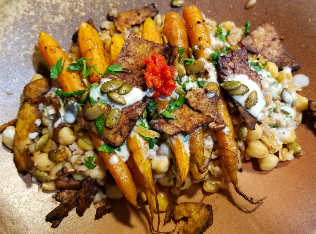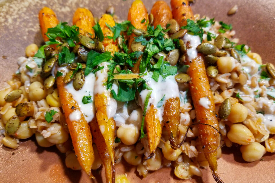5. To assemble the dish, pour the farro and chickpea mixture onto a large serving platter. Arrange the carrots in a single layer over the mixture. Drizzle herbed tahini generously over the carrots, then sprinkle them with pepitas and one tablespoon chopped fresh parsley. Serve immediately or let the dish cool to room temperature (it’s good either way!).