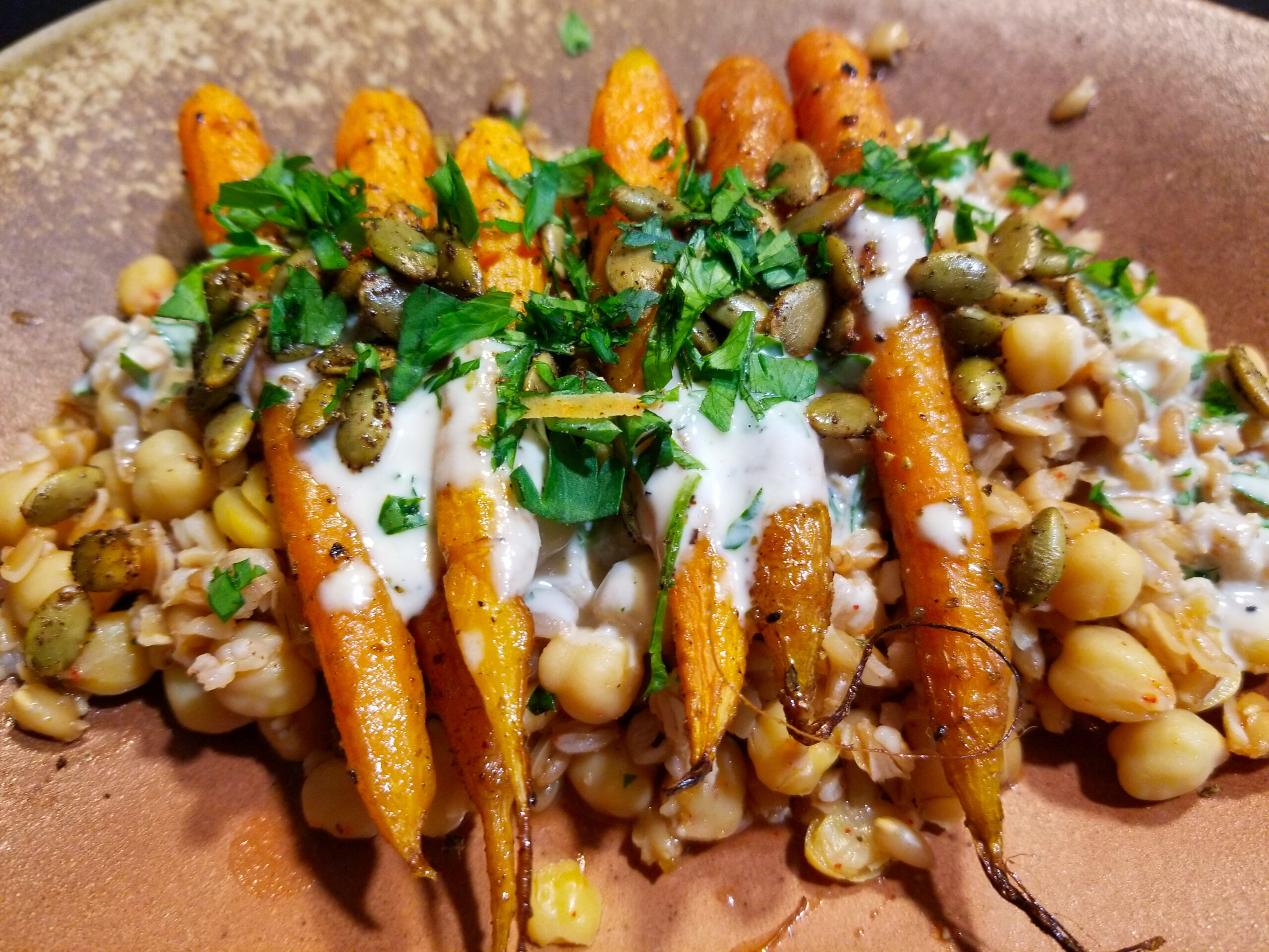 5. To assemble the dish, pour the farro and chickpea mixture onto a large serving platter. Arrange the carrots in a single layer over the mixture. Drizzle herbed tahini generously over the carrots, then sprinkle them with pepitas and one tablespoon chopped fresh parsley. Serve immediately or let the dish cool to room temperature (it’s good either way!).
