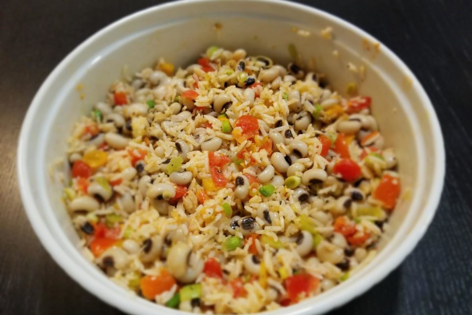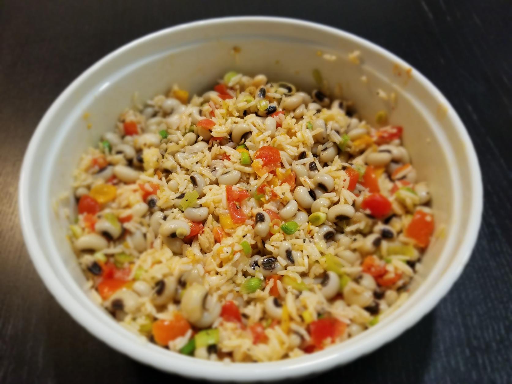 Black eyed peas, rice, tomatoes, scallions, and hot sauce