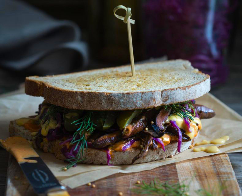 8. Remove from the pan and smear the unbuttered side of one slice with a good dollop of the dressing before following with a generous handful of the mushrooms. If you are using cheese slices, add a slice, then add the sauerkraut and slices of the dill pickle.