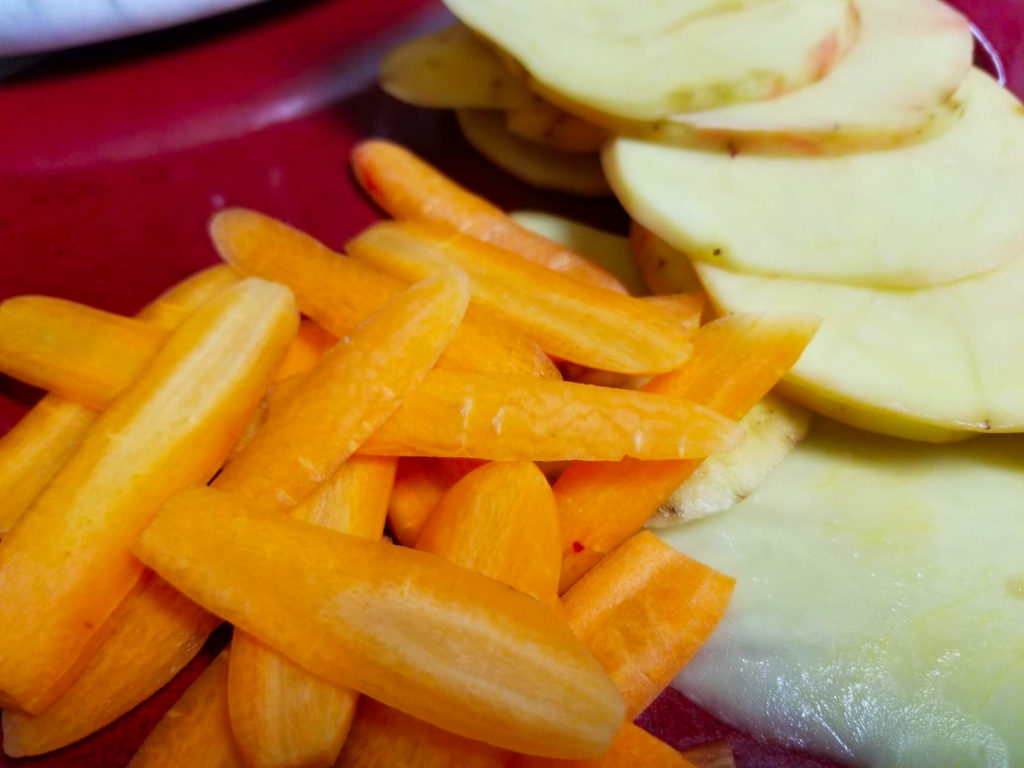 8. Once the beets are getting soft, add the potatoes, carrots and garlic. Toss w/ more olive oil, salt, pepper, a generous dose of bulldog paprika and a little basque paprika (or something spicy). Cook veggies for 15-20 minutes, until desired softness.