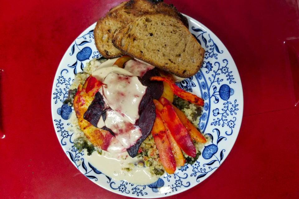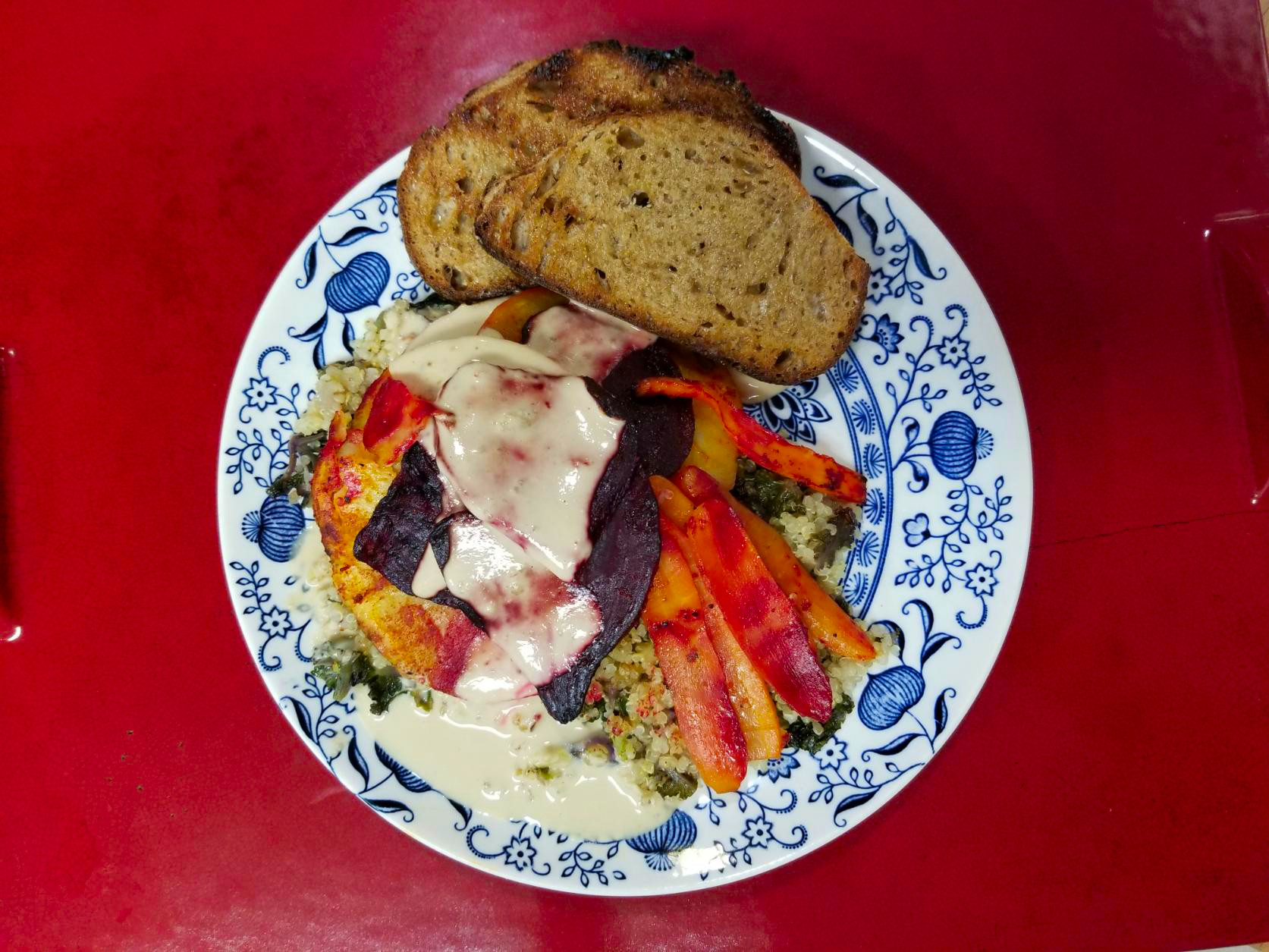 Quinoa w/ root veggies, tahini sauce on top, topped w/ crunchy quinoa