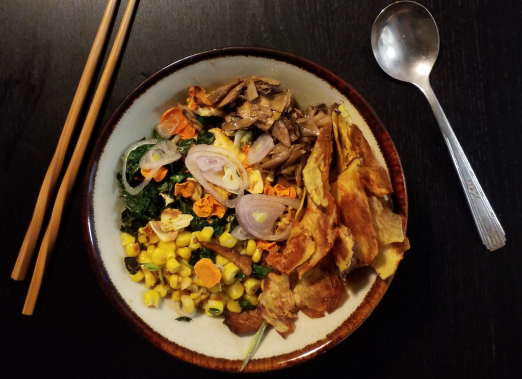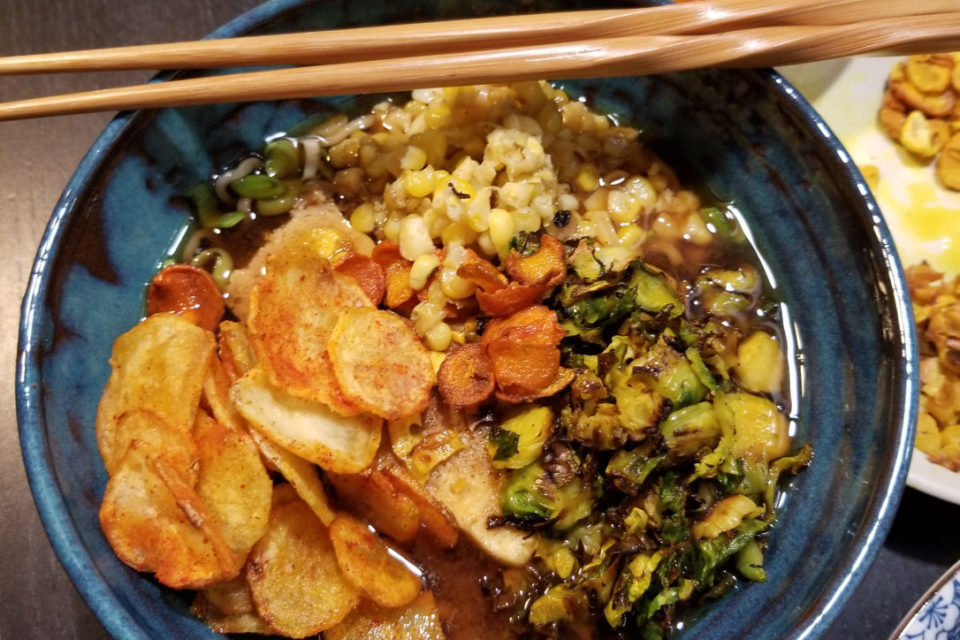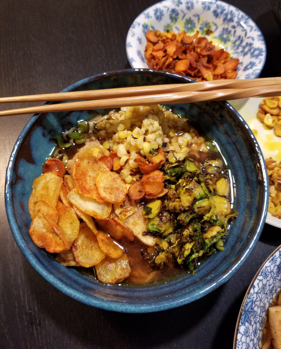 Ramen w/ potato chips, garlic chips, tumeric chips, brussel sprouts, mushrooms, corn, tofu