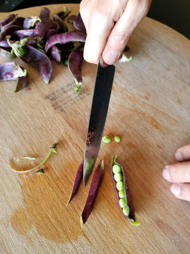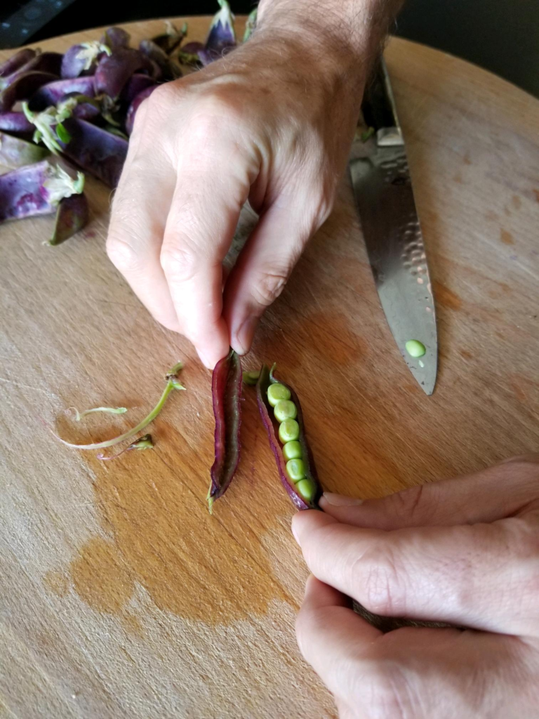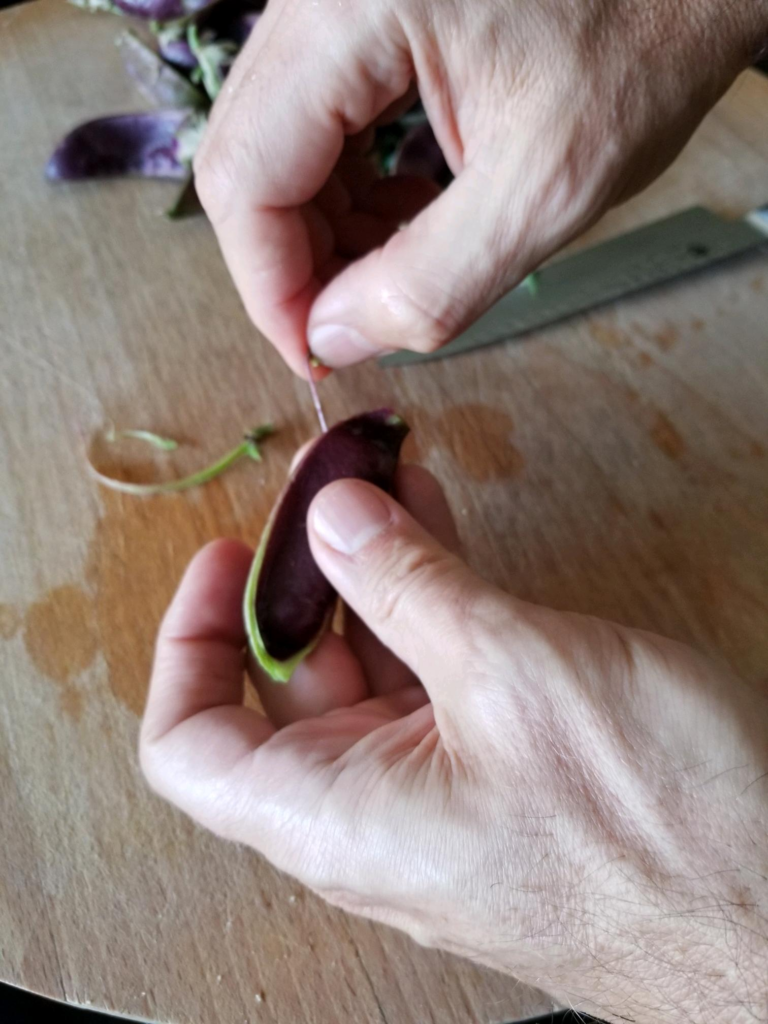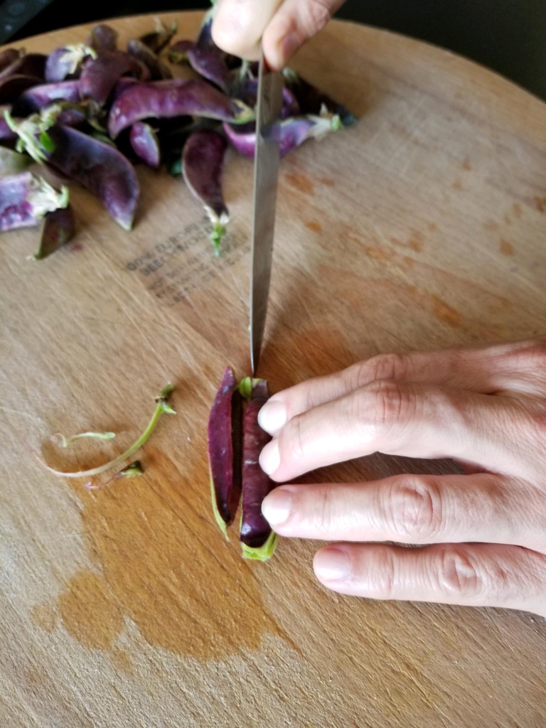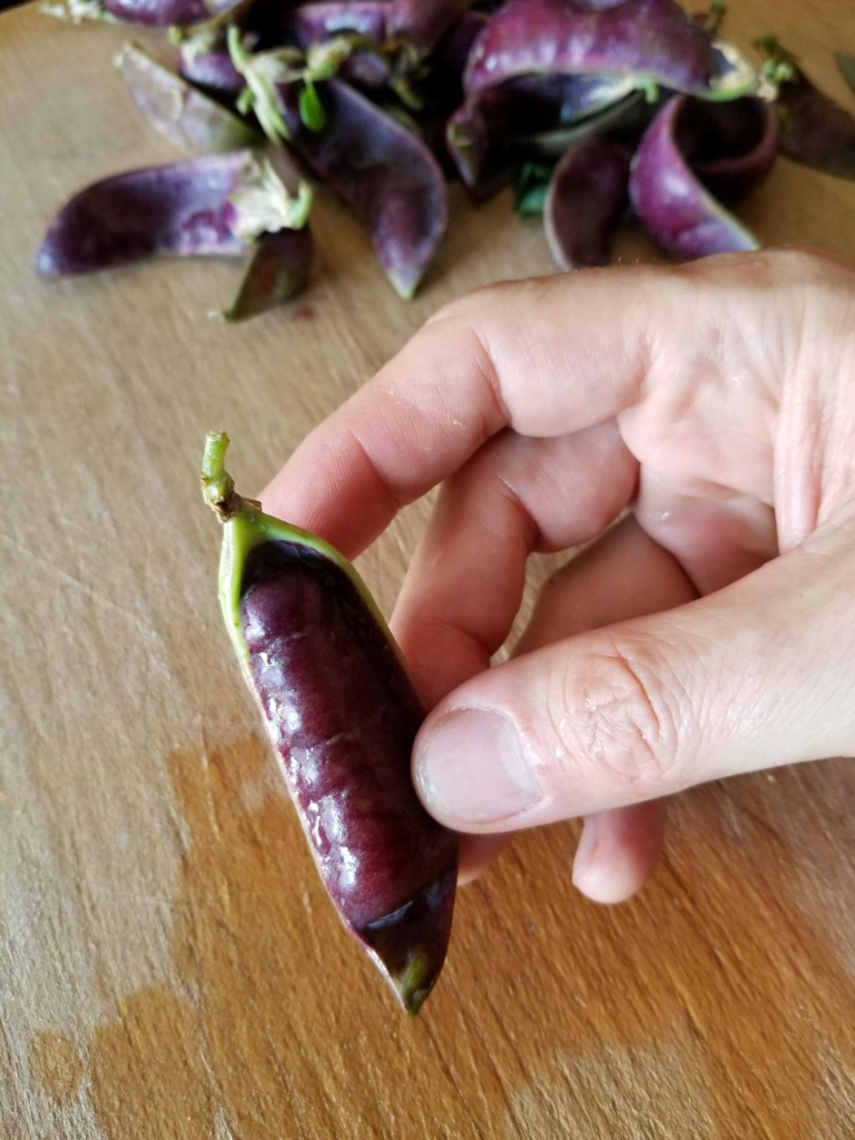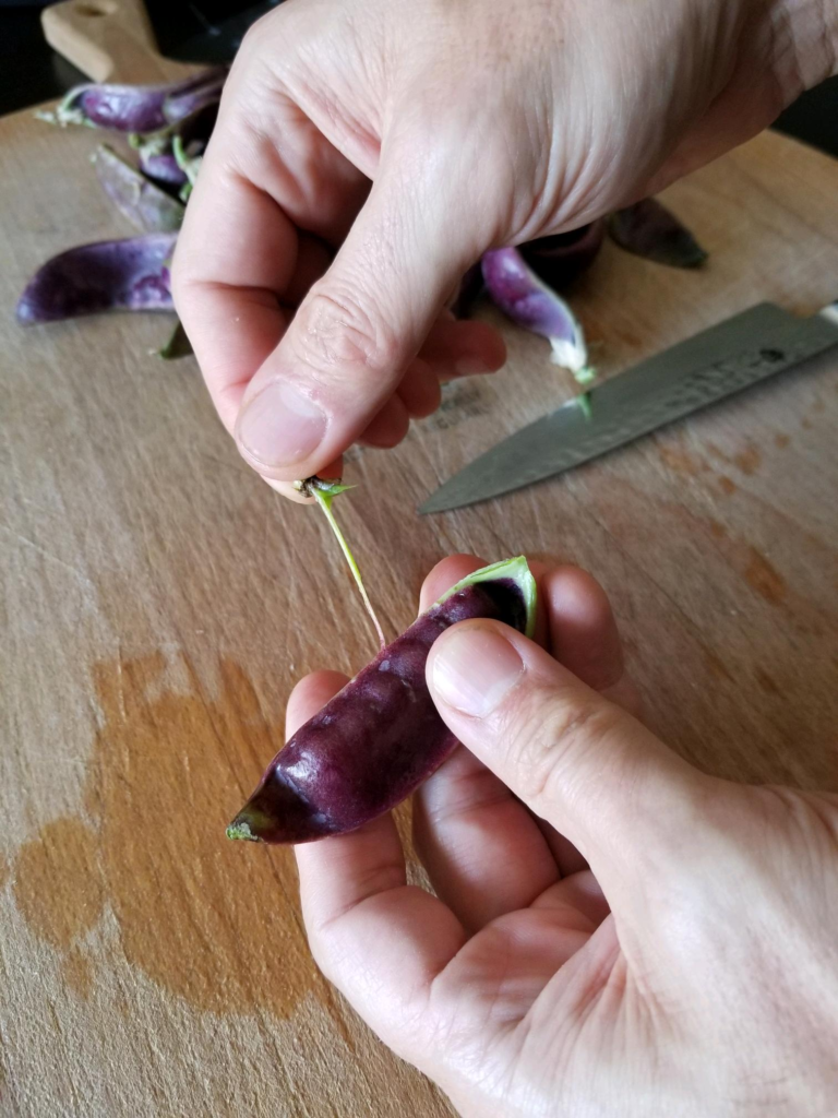 3. Pull the strings on the peas and toss them. Sometimes there are strings on both sides of the purple peas.