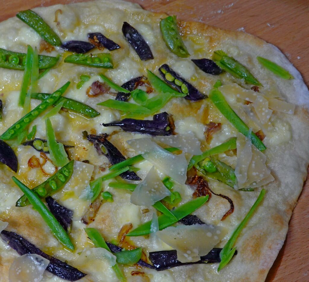 15. Add the mozzarella to the pizza. Spread out the flashed shallots and snap peas. Add the raw julienne peas. Cook the pizza for 5-7 minutes until cheese bubbles. (NOTES: Parm cheese on this version is not required! This picture has far fewer shallots than recommended, and a few less peas than recommended.)