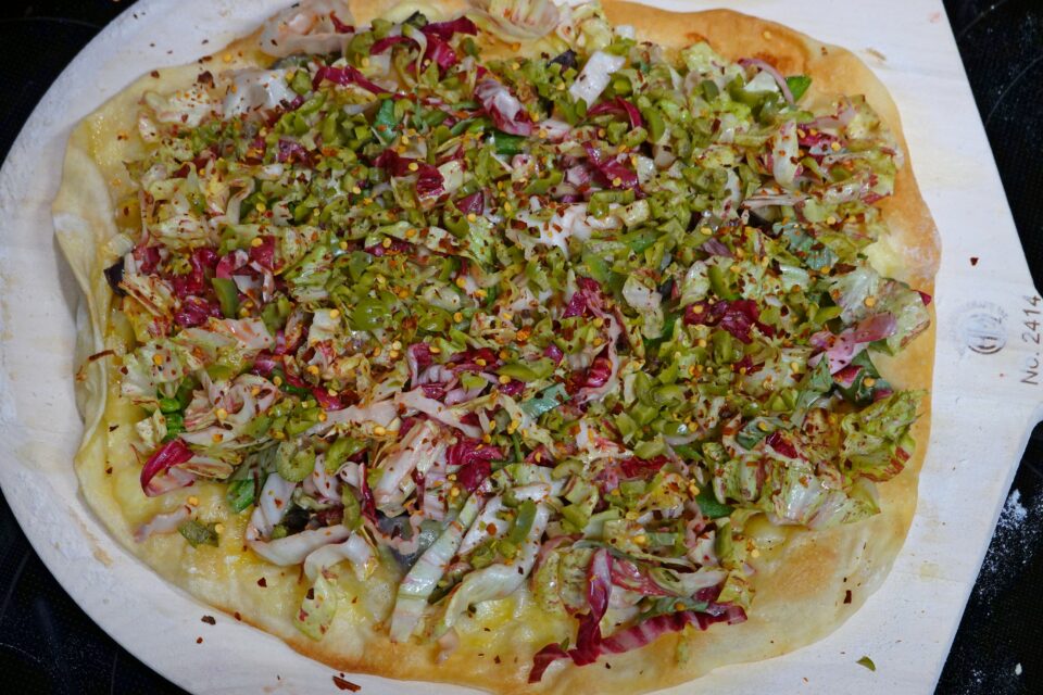 7. Prebake the pizza dough on 425 for ~5 minutes. Don’t let it get brown! Depending on the pizza oven/pizza board, maybe flip to cook both sides of the dough.